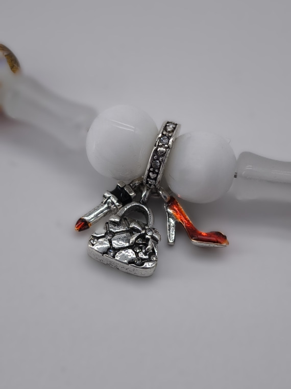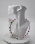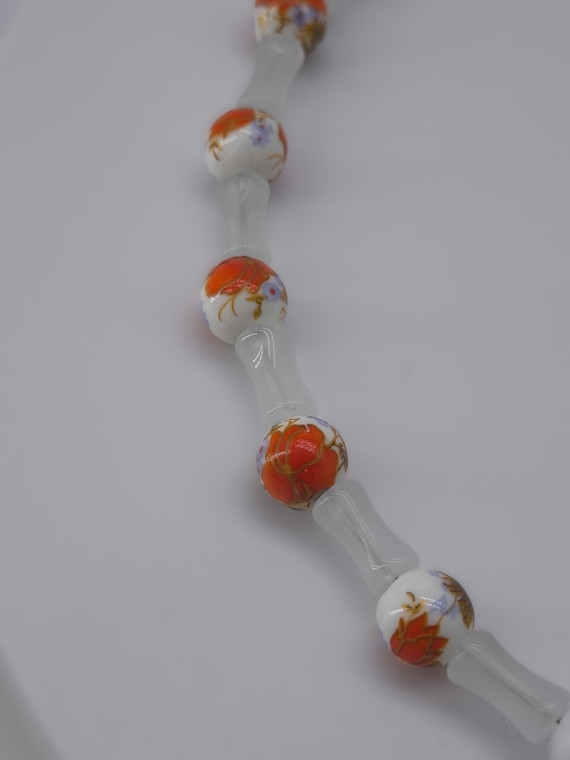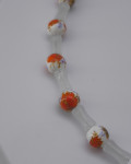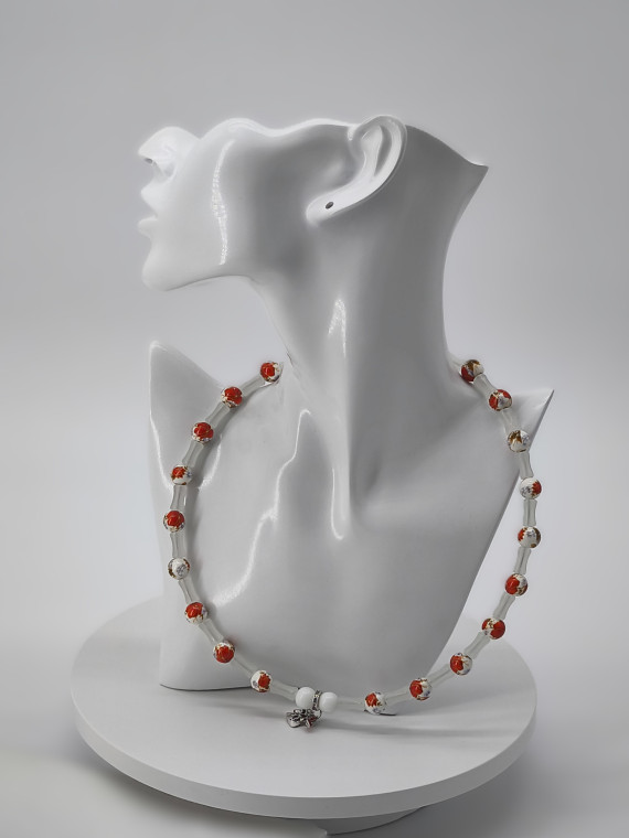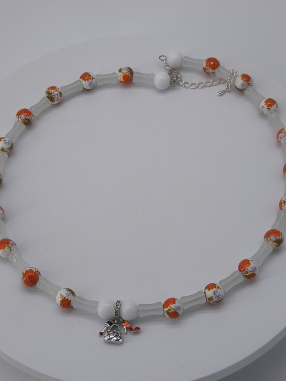 A graceful necklace with orange-white beads and soft translucent elements. A tiny heart charm completes the look. Adjustable length 51+7 cm.