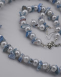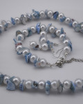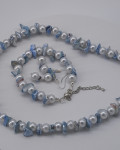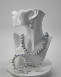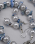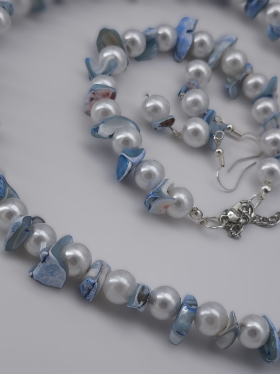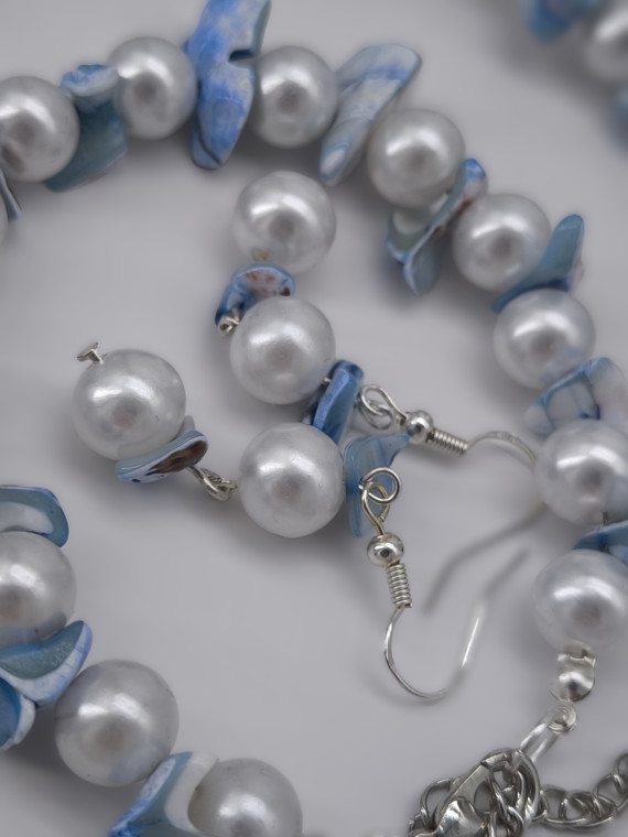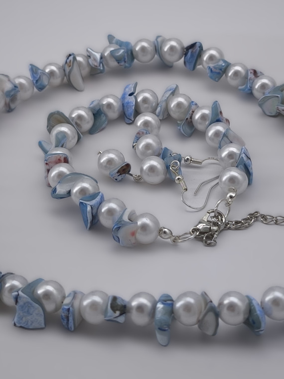 A delicate necklace, bracelet, and earring set combining pearly shine with gentle blue accents. The beads shimmer beautifully in the light, adding elegance and a soft glow to your look. Perfect for everyday wear or special occasions.
