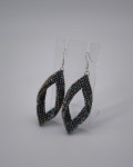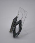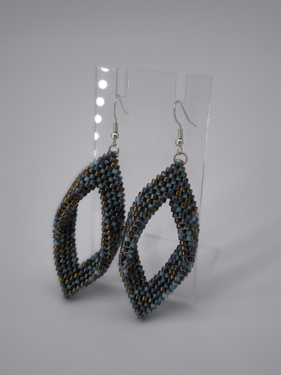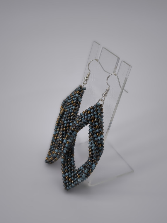 Elegant handmade beaded earrings, 6.5 cm long, crafted in deep smoky blue and bronze tones. Their sculpted woven shape creates a refined yet confident accent. A versatile choice for those who appreciate accessories with character and a rich, understated palette.