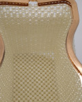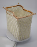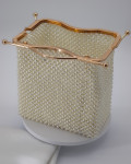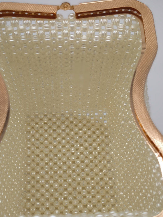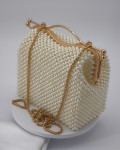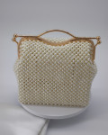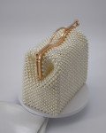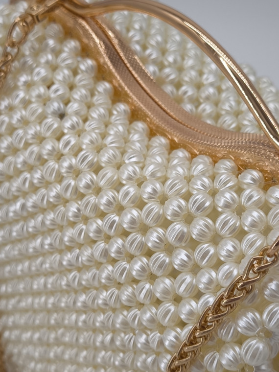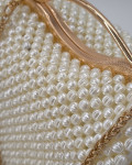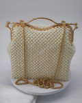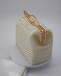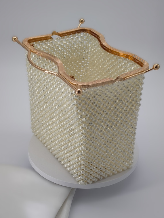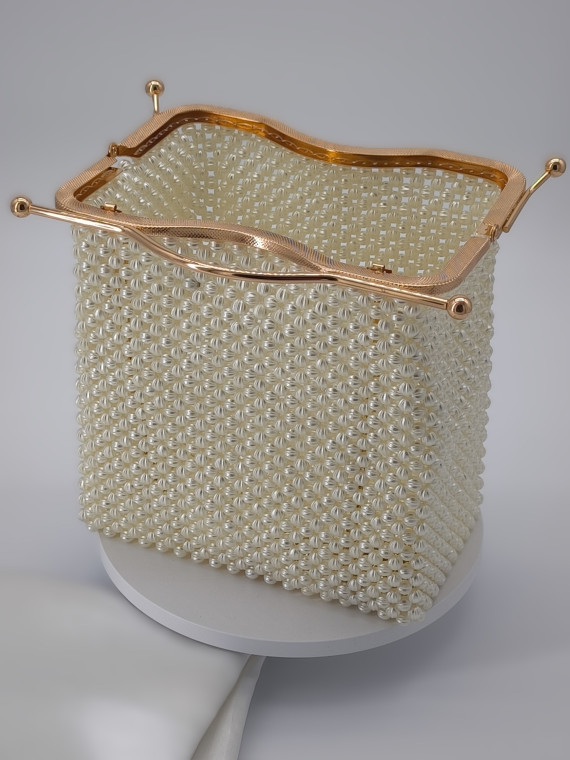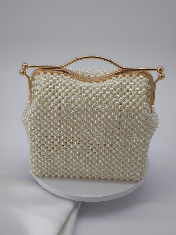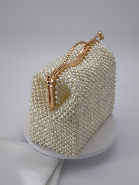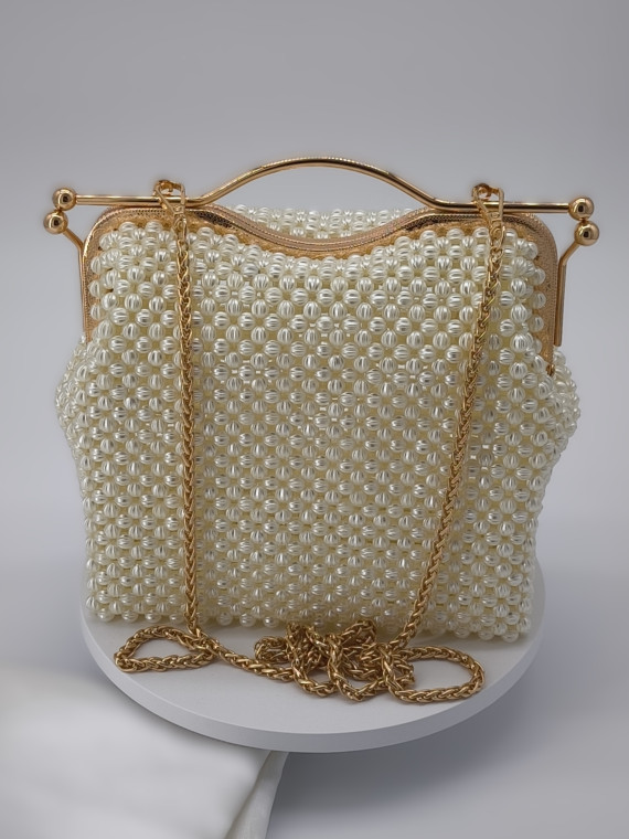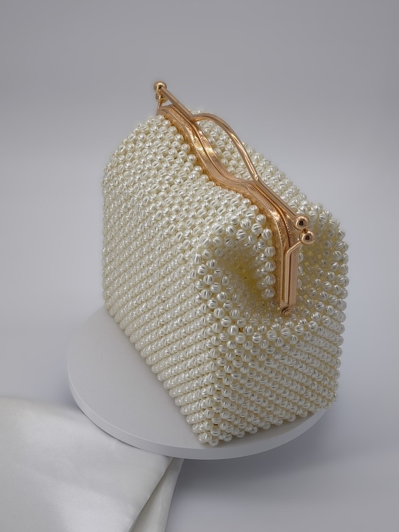An elegant handbag handcrafted from lustrous pearl-like beads with a refined golden frame.