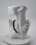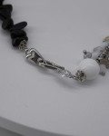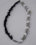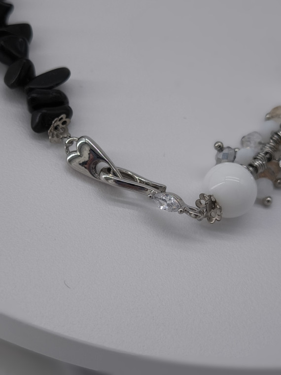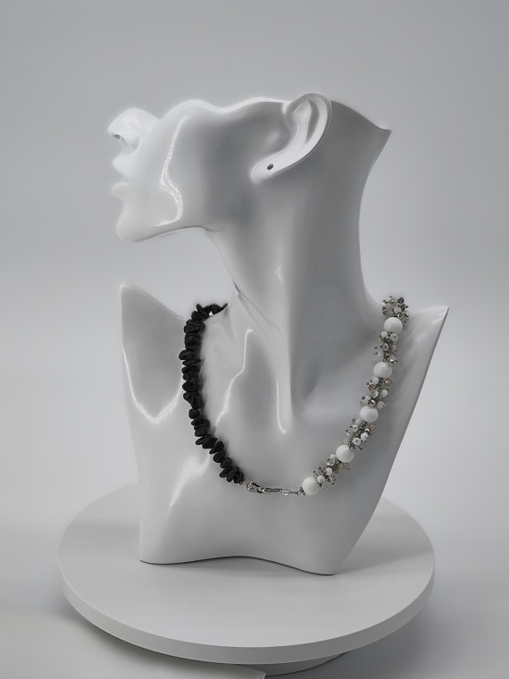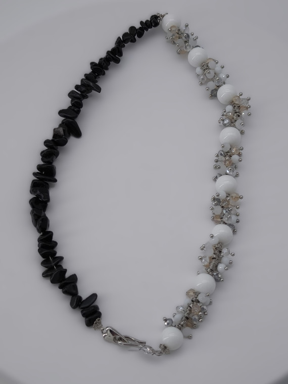 Asümmeetriline kaelakee mustade kividega ja heledate, kristallilaadsete detailidega. Ees olev kinnitus toimib disainielemendina. Pikkus 43 cm.