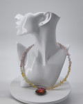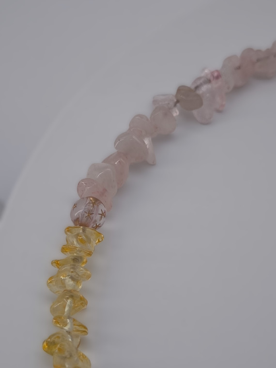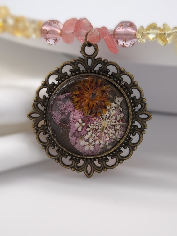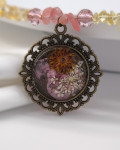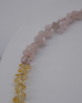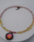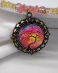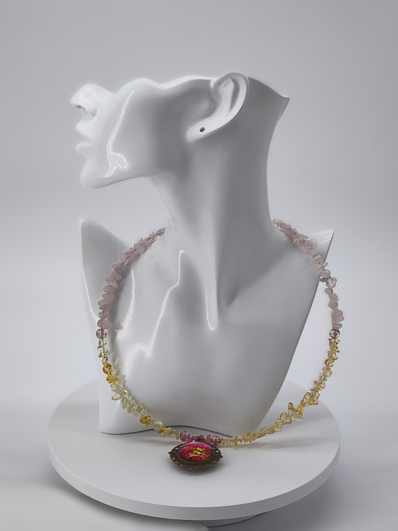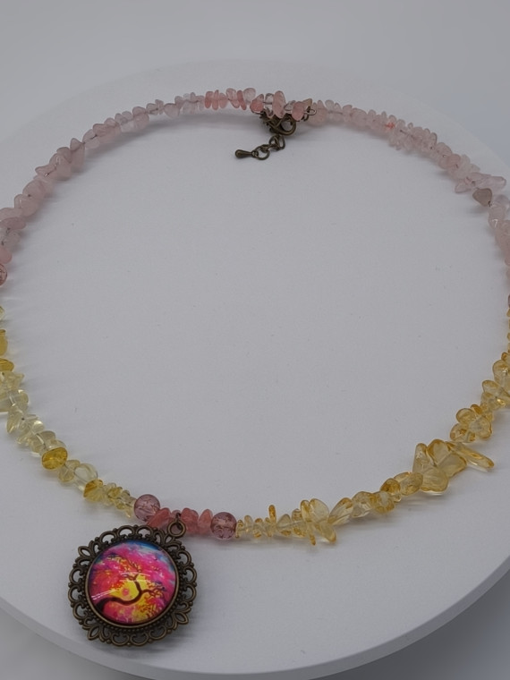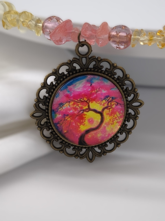 Õrn värviüleminek roosast kollaseni ja erks puumotiiviga ripats moodustavad harmoonilise terviku. Pikkus 54+7 cm.