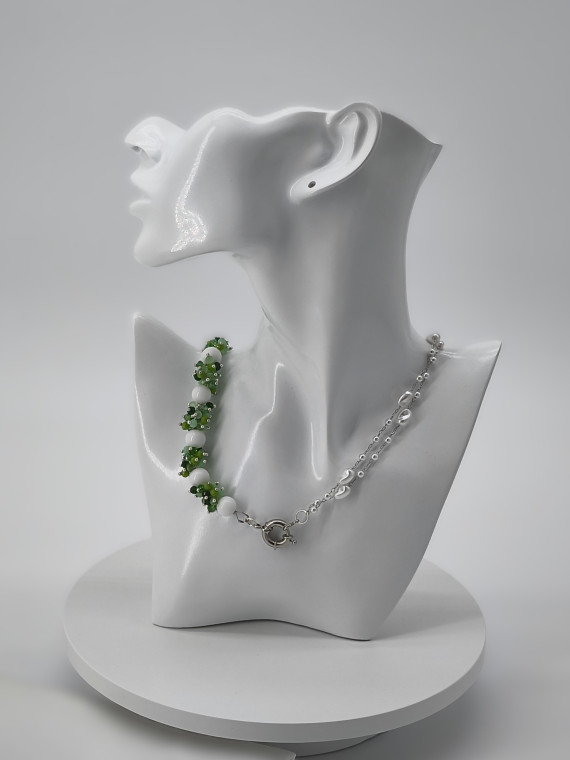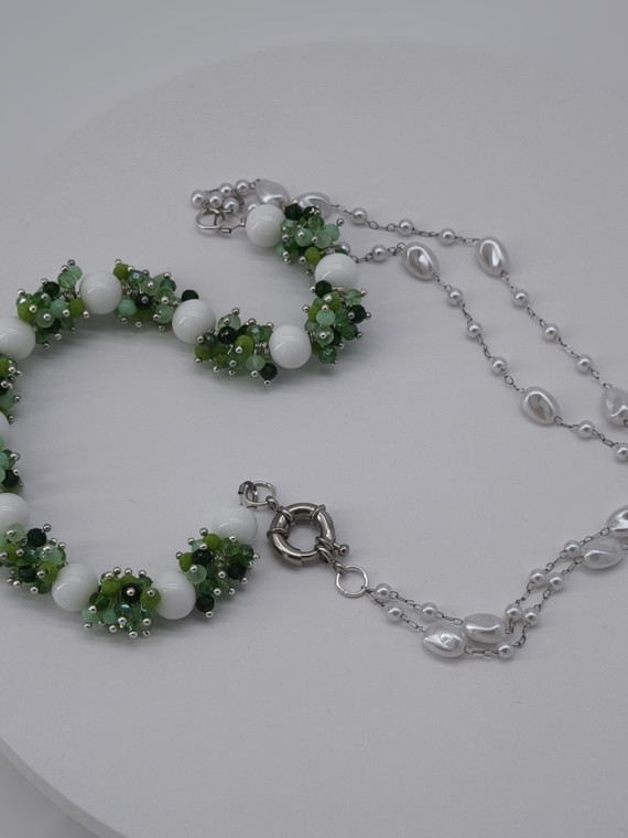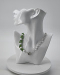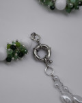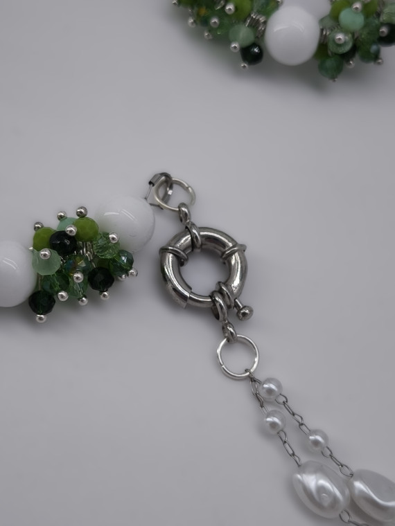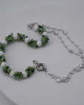 Ees kinnitusega kaelakee, mis ühendab rohelise „marjaklastri“ ning õrna pärlilaadse topeltahela. Pikkus 56 cm.