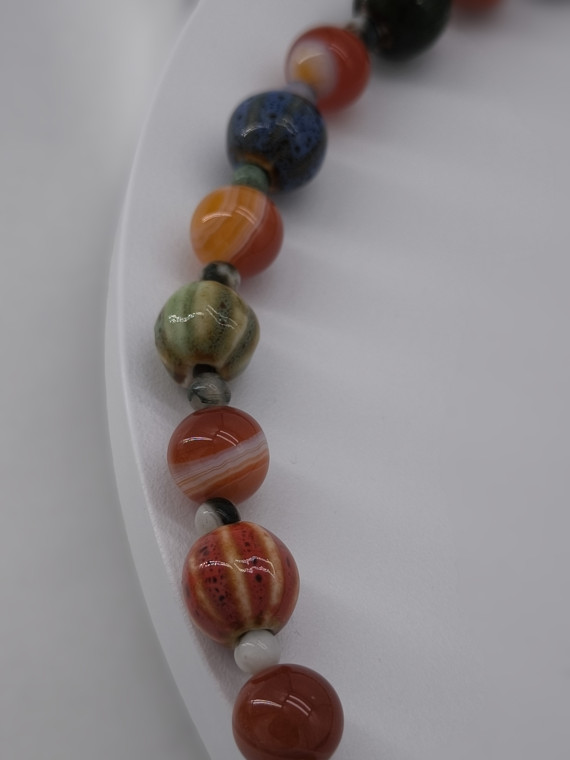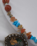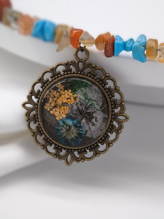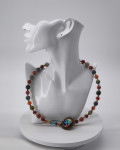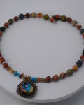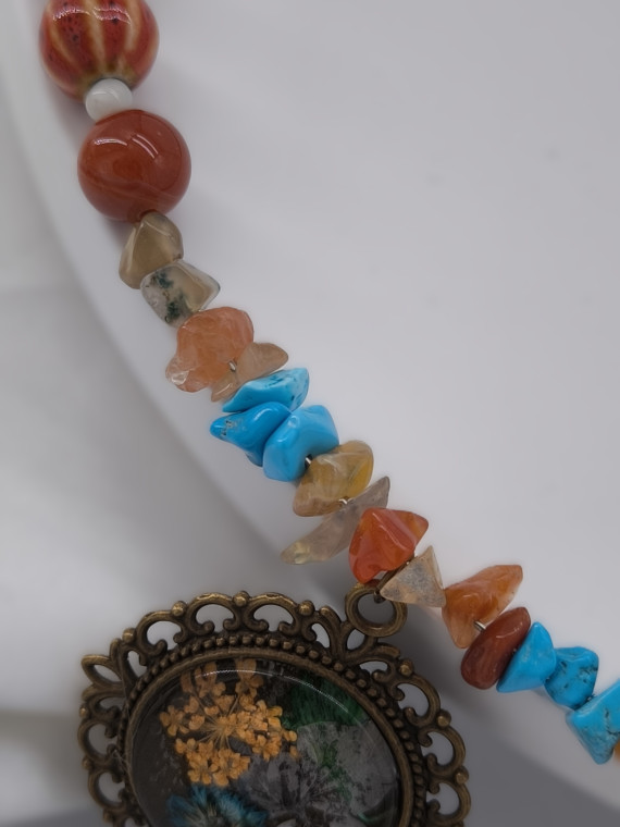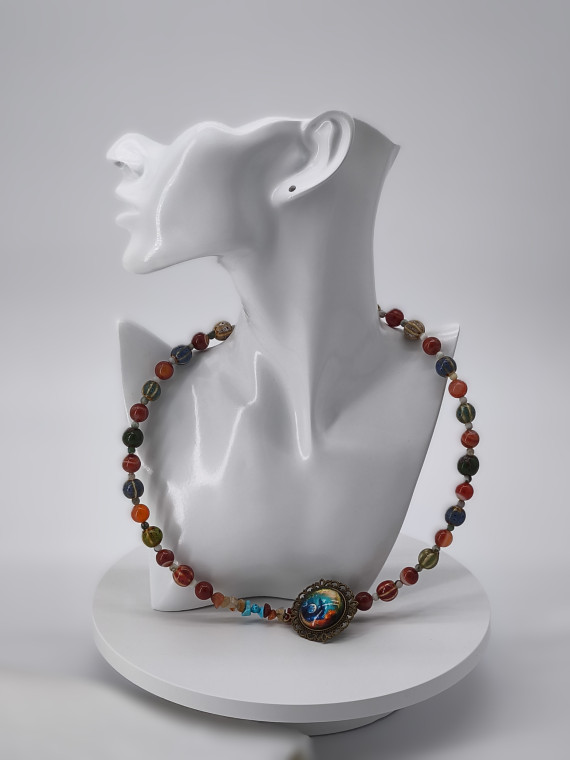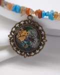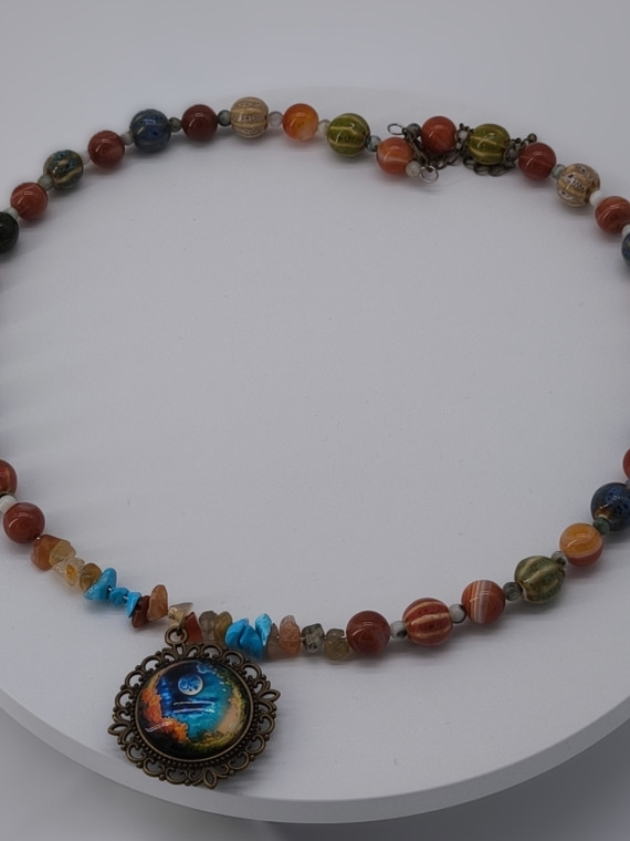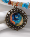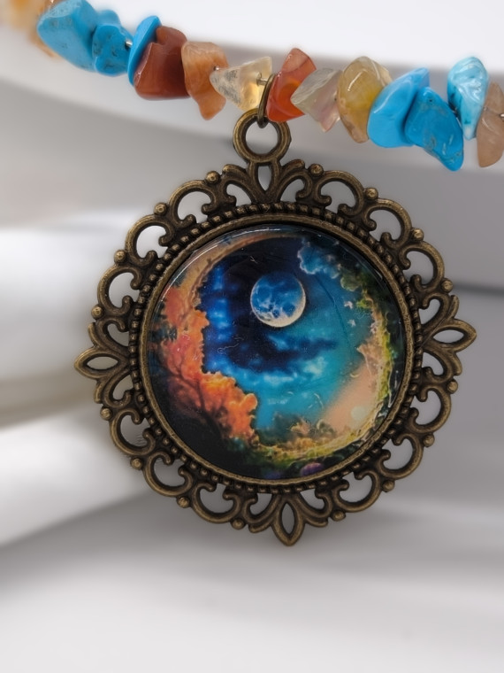Soojad punakas-oranžid toonid kohtuvad jahedate siniste ja roheliste aktsentidega. Kuuvalguse maastikuga ripats lisab sügavust. Pikkus 56+7 cm.