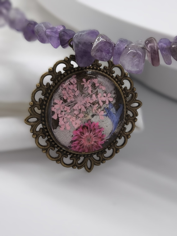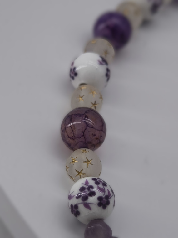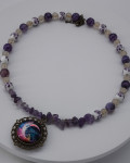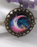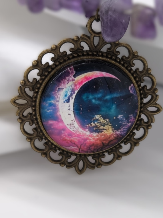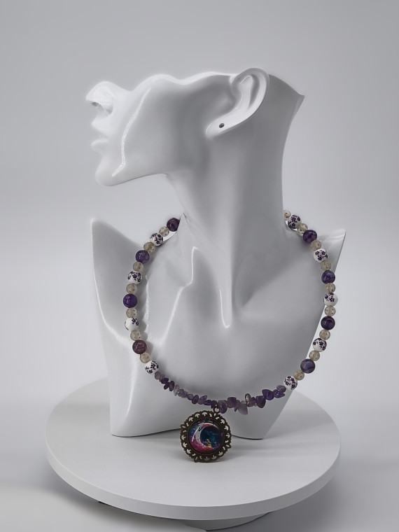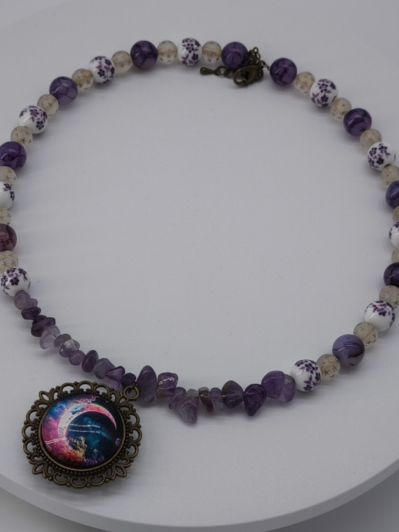 Lilla ja violetsed helmed koos killustunud detailidega loovad öise, müstilise meeleolu. Kuuillustratsiooniga ripats lisab sügavust. Pikkus 46+7 cm.