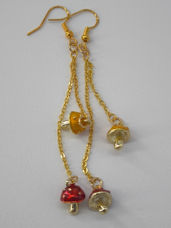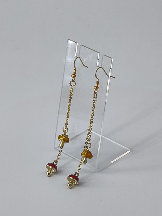 Серьги «Лесные Грибочки» добавят в ваш образ нотку сказочности и игривости. Миниатюрные подвески-грибки красного и жёлтого цвета на золотых цепочках смотрятся оригинально и легко. Длина — 7,5 см. Отличный выбор для любителей необычных аксессуаров и природных мотивов.