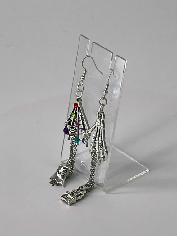 Серьги «Заклятие Хэллоуина» — это дерзкий и мистический аксессуар для любителей оригинальности. Дизайн объединяет паутину с разноцветными камнями, костяную руку и подвески-призраки 👻. Длина серёг — 8 см. Смелое украшение для тематических вечеринок и тех, кто любит выделяться.