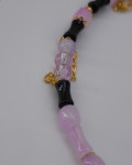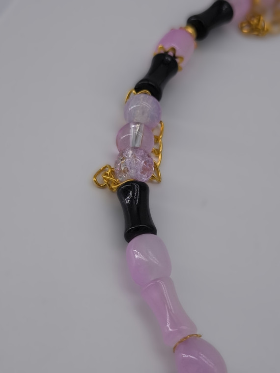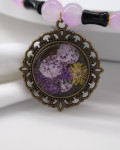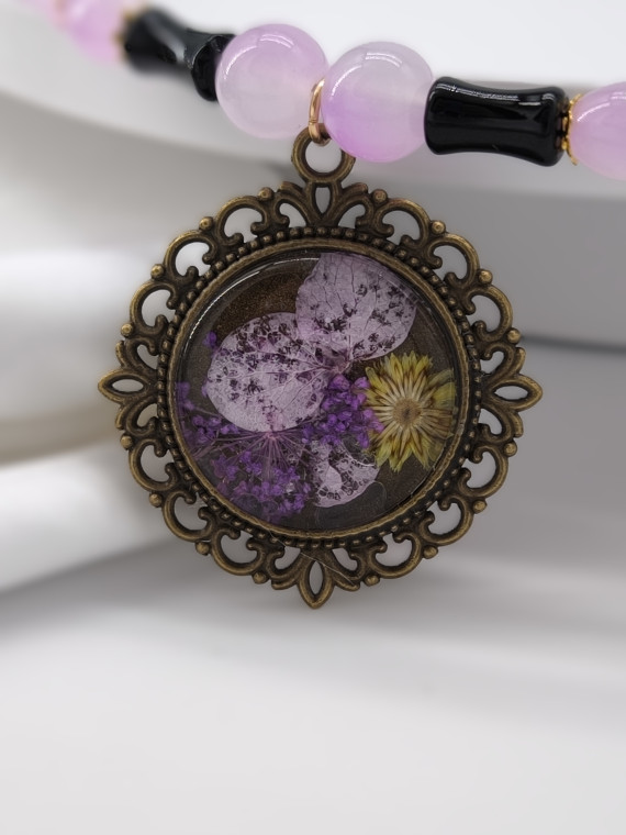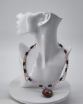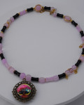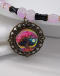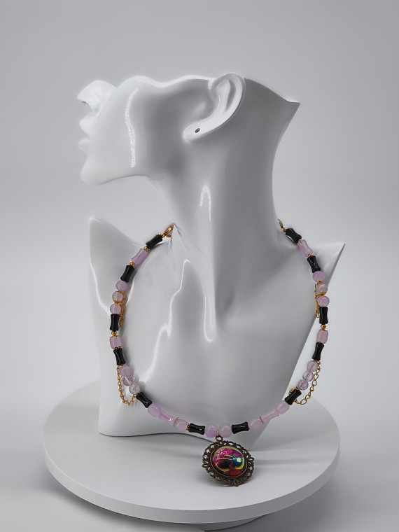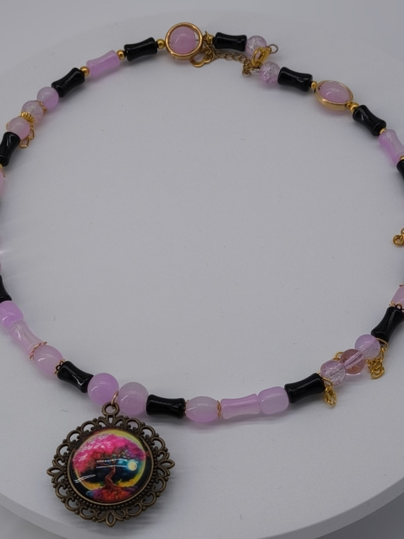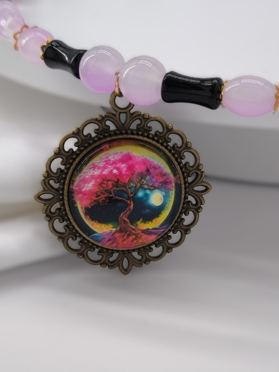 Контраст чёрных и розово-лиловых бусин подчёркивает подвеску с фантазийным изображением дерева под луной. Украшение выглядит ярко, атмосферно и собранно. Длина 50+5 см — регулируемая, хорошо ложится по линии ключиц.