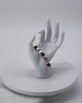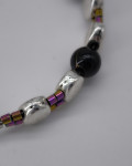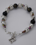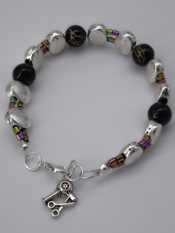 Стильный браслет ручной работы длиной 19 см, выполненный из чёрных глянцевых бусин, серебристых элементов и радужного бисера. Украшен подвеской в виде фена и ножниц — идеальный аксессуар для парикмахера, стилиста или визажиста. Акцентный, выразительный и с чётким характером.