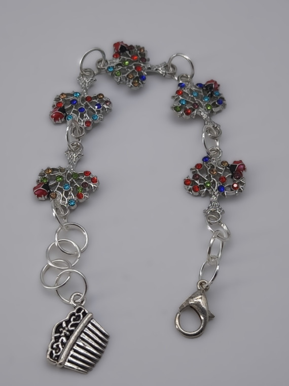 Яркий браслет ручной работы длиной 16 см, украшенный декоративными деревцами с разноцветными камнями. Подвеска в виде гребня добавляет игривый творческий акцент. Украшение подойдёт тем, кто любит необычные детали, яркие краски и лёгкую фантазию в образе.
