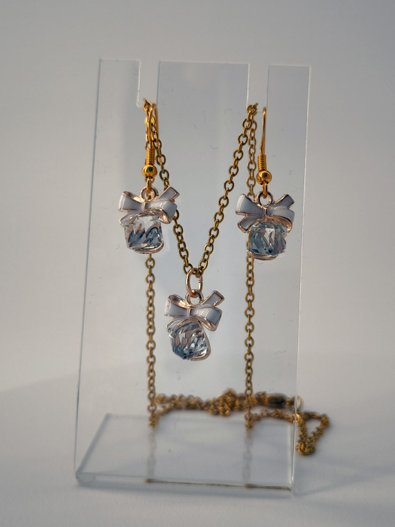 Комплект украшений «Белый подарок» излучает нежность и лёгкость. Подвеска и серьги выполнены в форме миниатюрных подарочных коробочек с бантом, украшенных прозрачным светло-голубым камнем. Этот набор символизирует чистоту и свет, идеально подходит как для повседневного образа, так и для особого случая. Цепочка регулируется по длине (45+5 см) для удобства ношения.